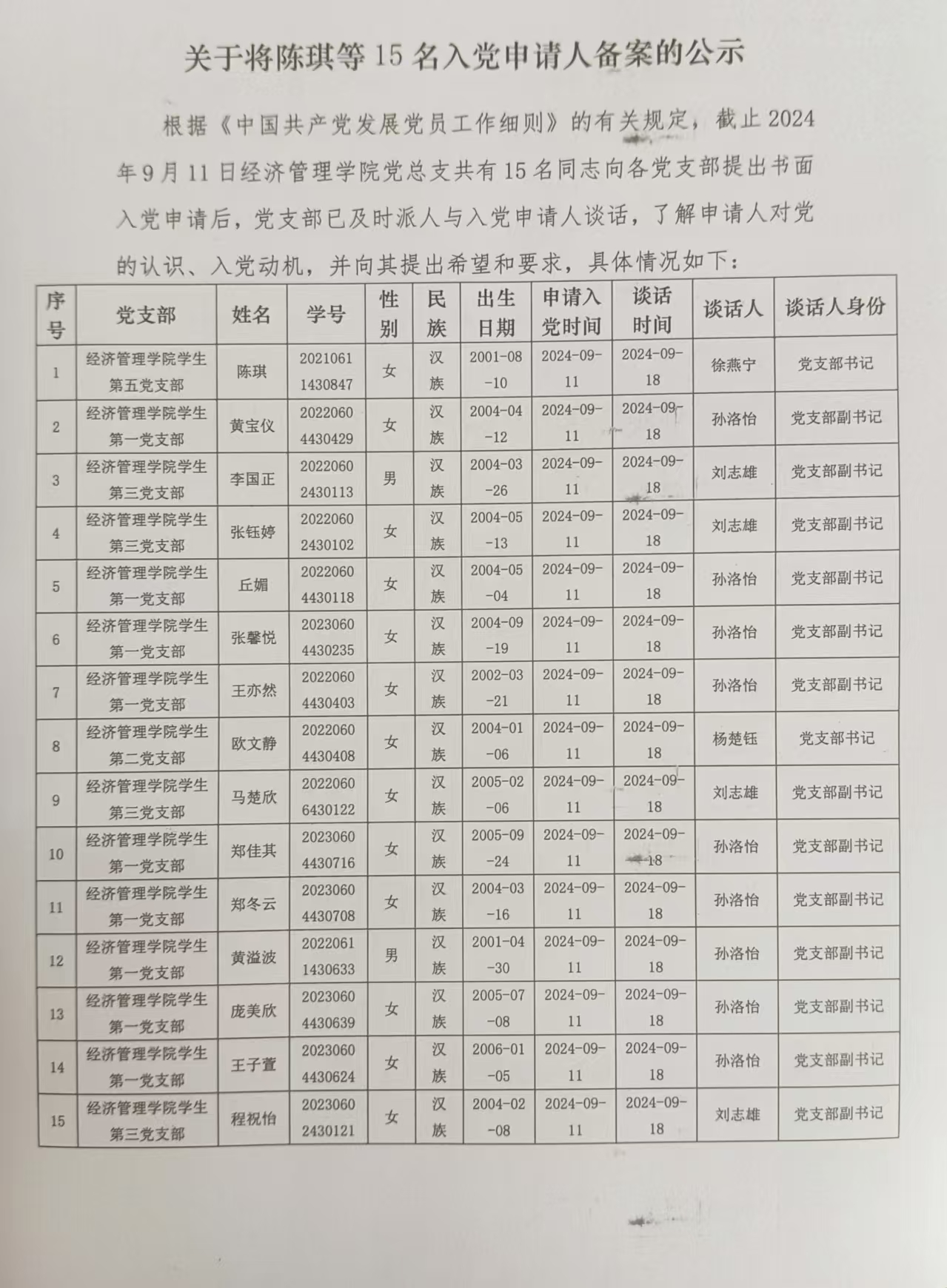 (通讯员:曾怡玲)根据《中国共产党发展党员工作细则》的有关规定,截止2024年9月11日suncitygroup太阳集团党总支共有15名同志向各党支部提出书面入党申请后,党支部已及时派人与入党申请人谈话,了解申请人对党的认识、入党动机,并向其提出希望和要求,具体情况如下: