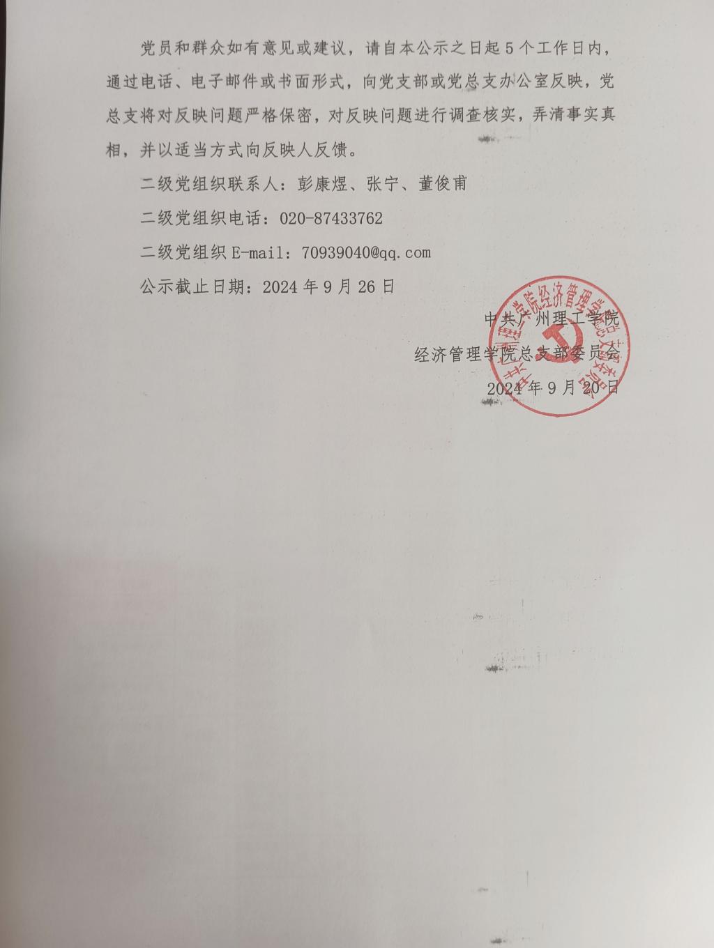 党员和群众如有意见或建议,请自本公示之日起5个工作日内,通过电话、电子邮件或书面形式,向党支部或党总支办公室反映,党总支将对反映问题严格保密,对反映问题进行调查核实,弄清事实真相,并以适当方式向反映人反馈。