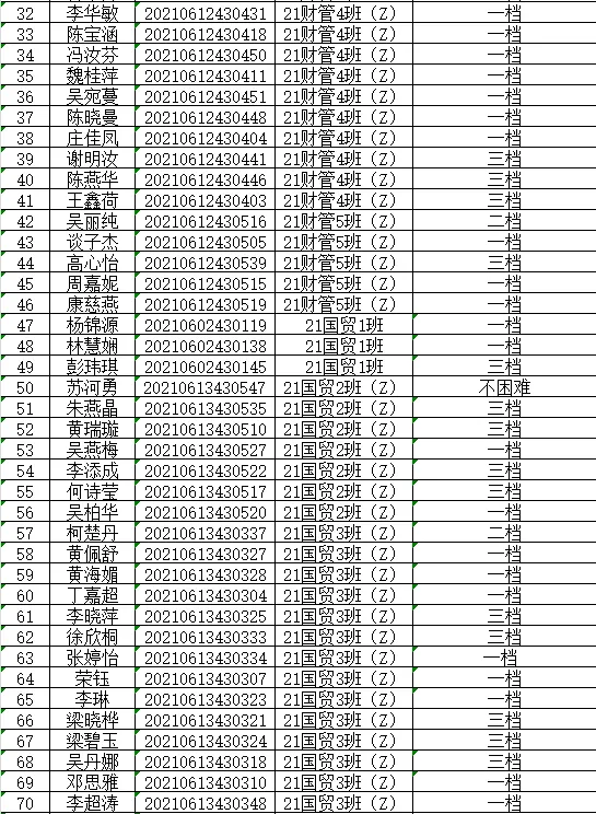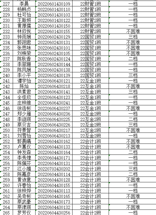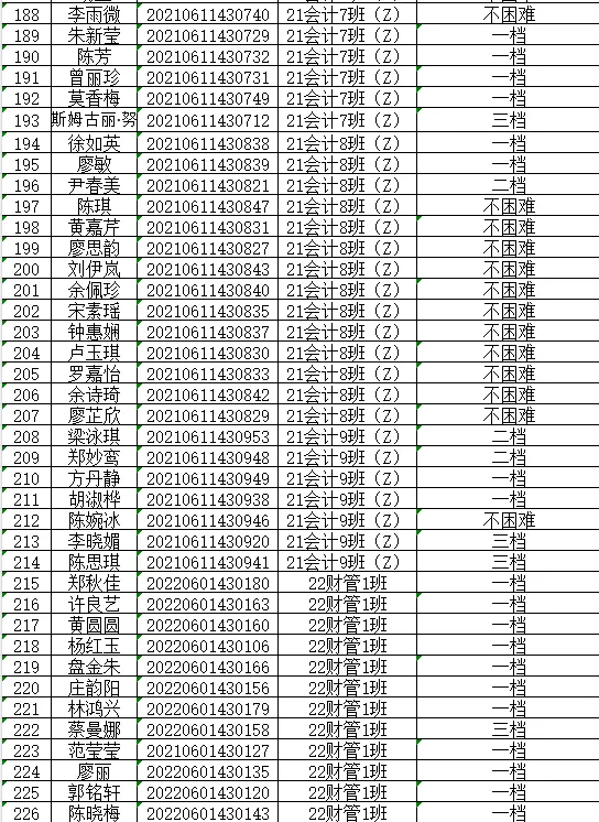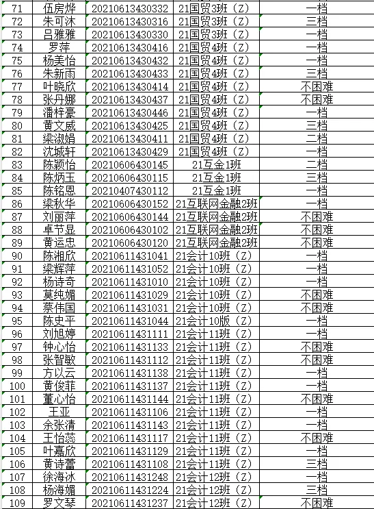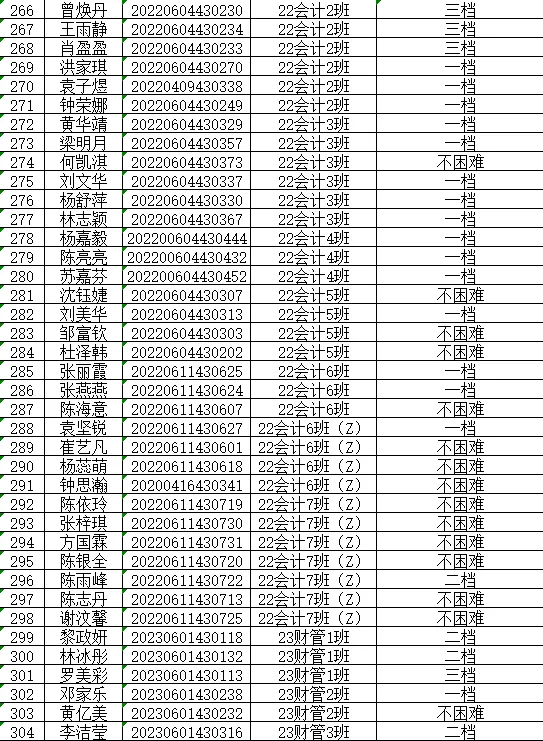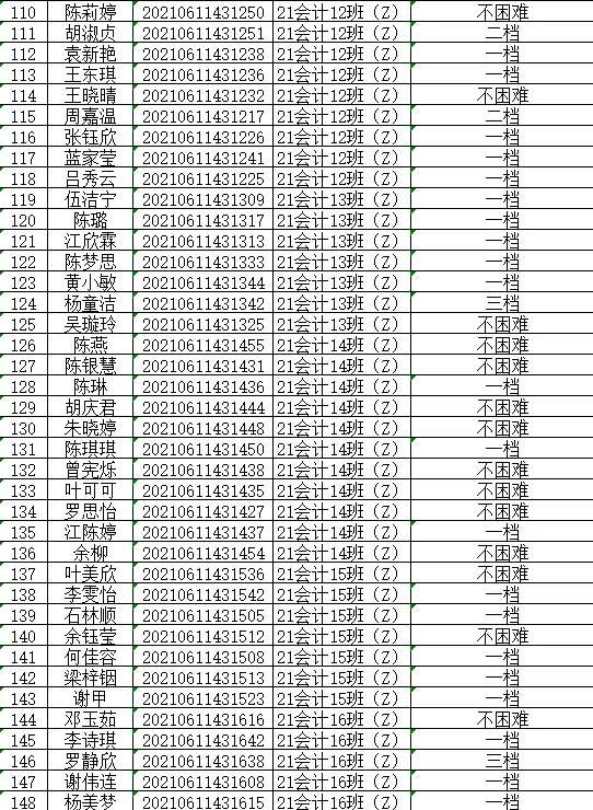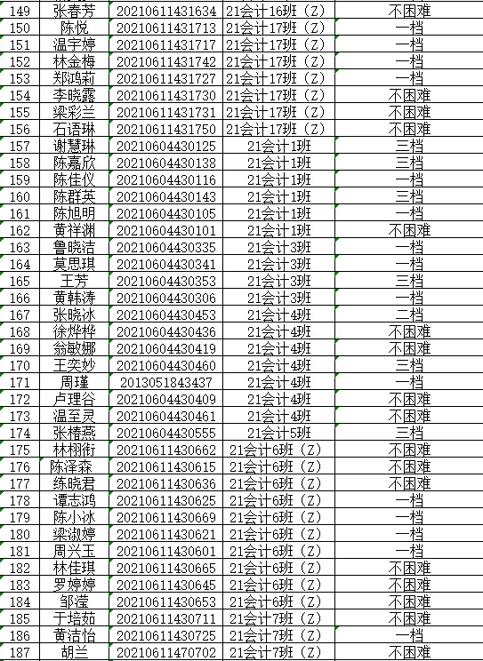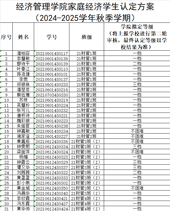 根据《关于做好2024年秋季学期家庭经济困难学生认定工作通知》(广州理工学助函(2024)13号),经学生本人申请以及班级、学院评审小组评议,现将我院2024年秋季学期家庭经济困难学生认定等级结果(此名单中的贫困等级仅是学院初审拟定结果,最终贫困等级结果以学校审核上报全国学生资助信息系统后由系统判定的贫困等级为准)在此予以公示。