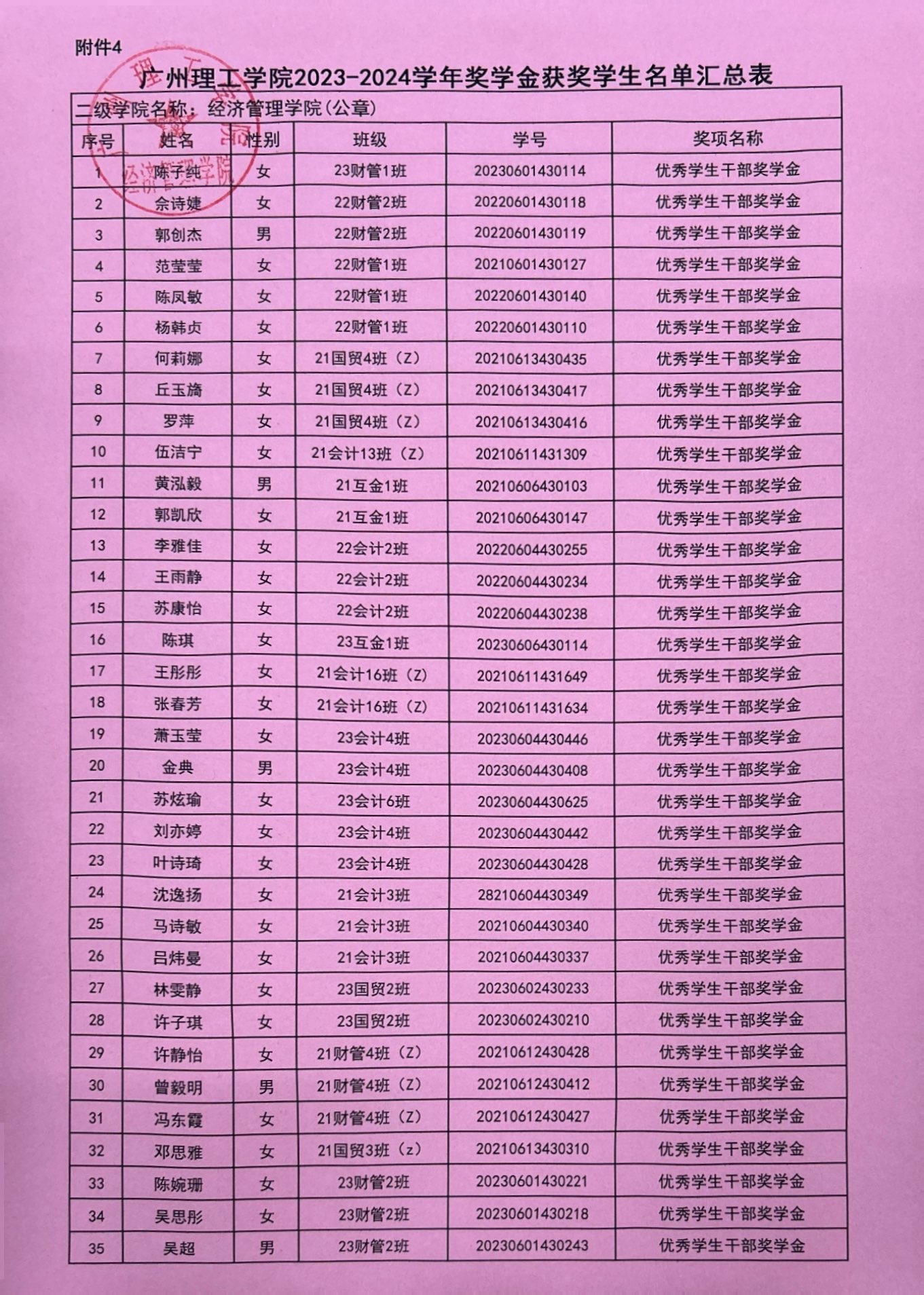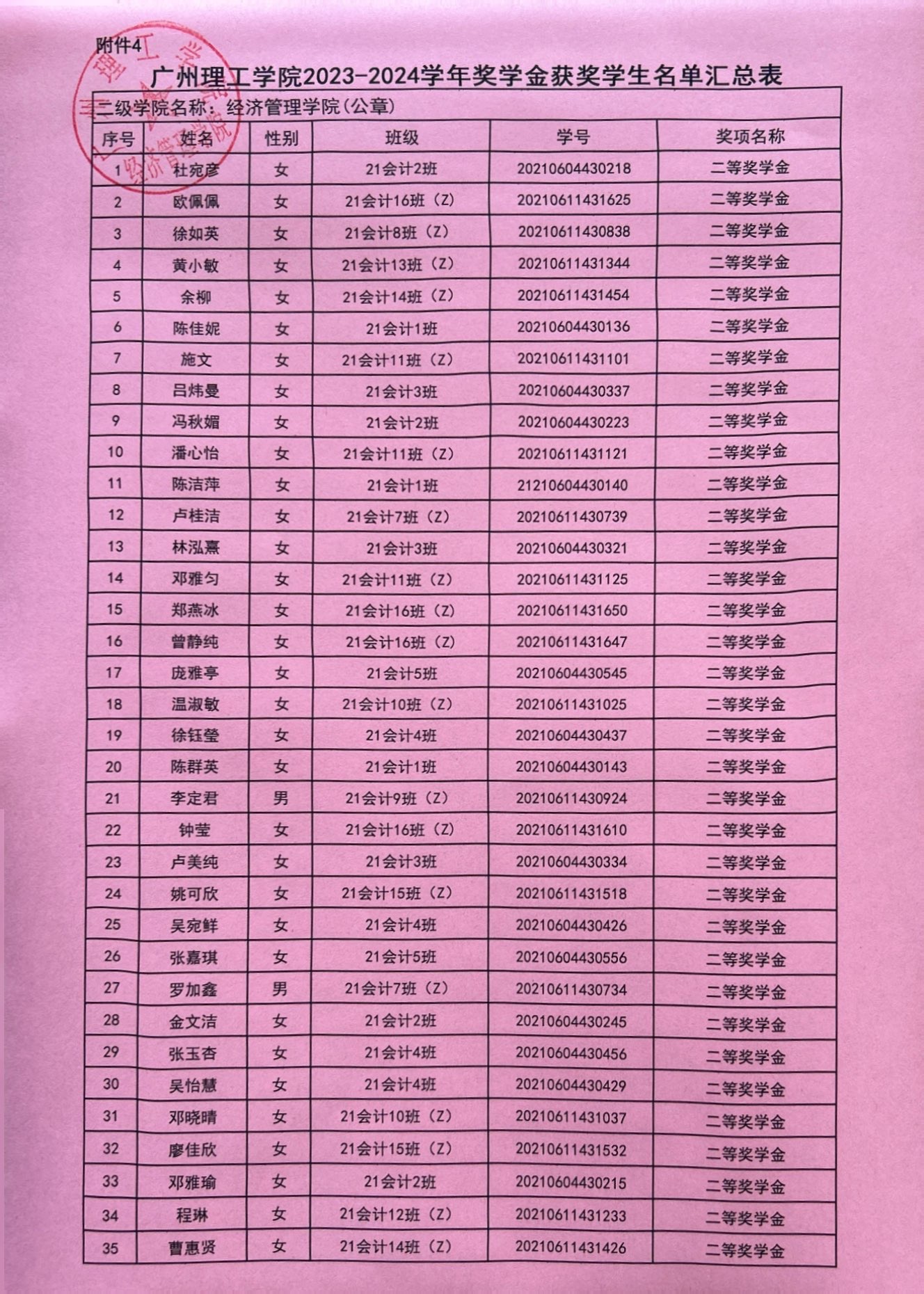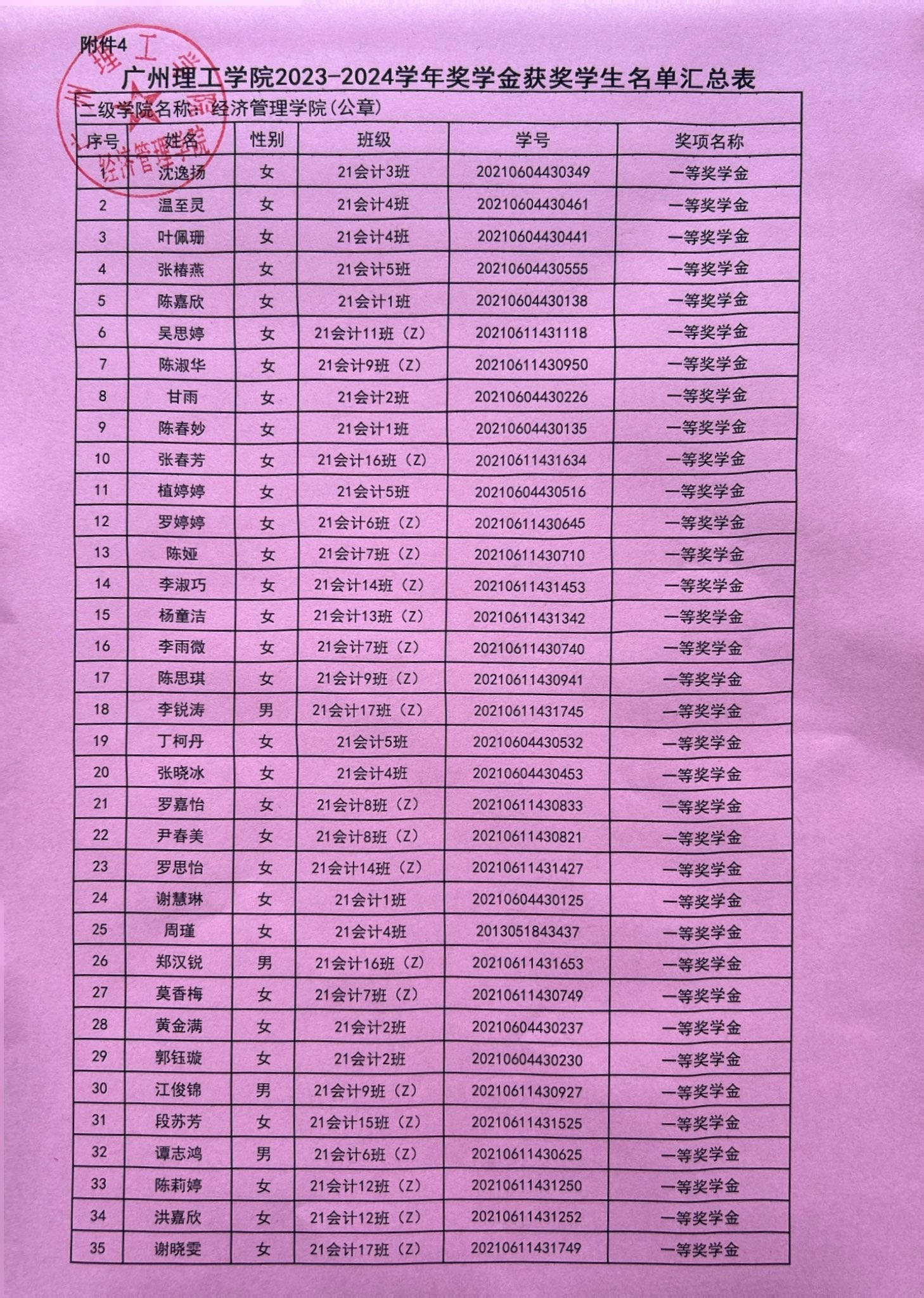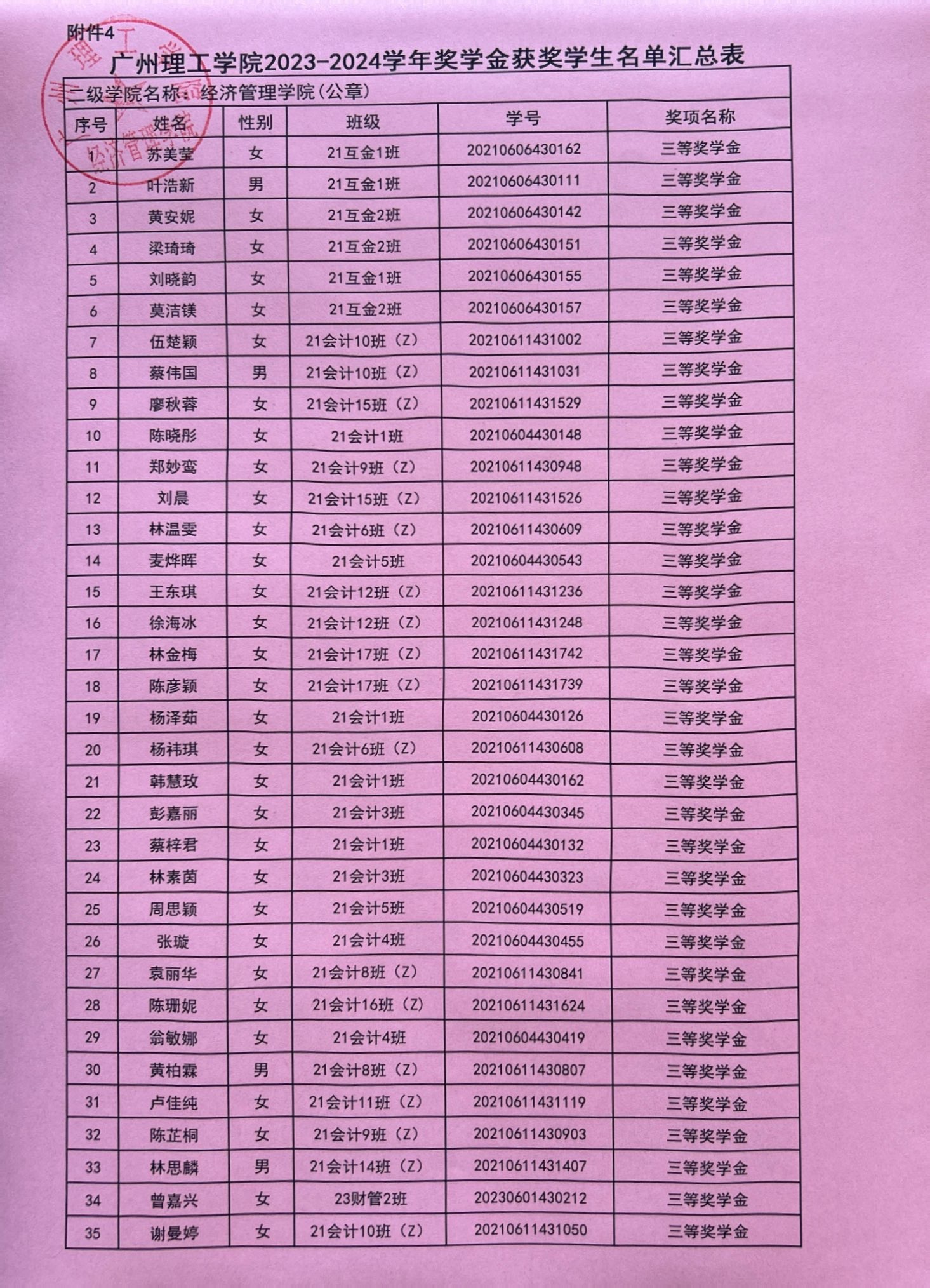根据《2023-2024学年奖学金评比工作方案》(广州理工学函〔2024〕148号),suncitygroup太阳集团本着公平、公正、公开的原则对奖学金申请材料进行严格评选,现对学院2023-2024学年奖学金拟获奖名单予以公示。公示时间从2024年9月27日至2024年9月29日。如对公示结果有异议,请于公示期间通过以下受理途径实名反馈。反映情况时需提供真实具体的材料,并签署姓名和联系电话;不提供具体事实材料或不签署真实姓名和联系方式的,对所反映情况将不予受理。