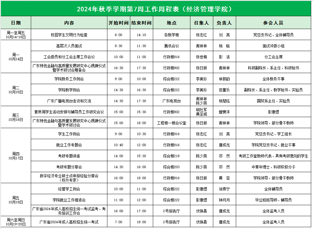 suncitygroup太阳集团2024年秋季学期第7周工作周程表