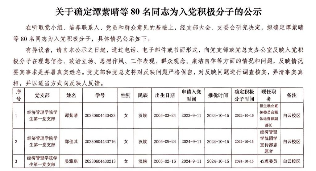 在听取党小组、培养联系人、党员和群众意见的基础上,经支部大会、支委会研究决定,拟确定谭紫晴等80名同志为入党积极分子,具体情况公示如下。