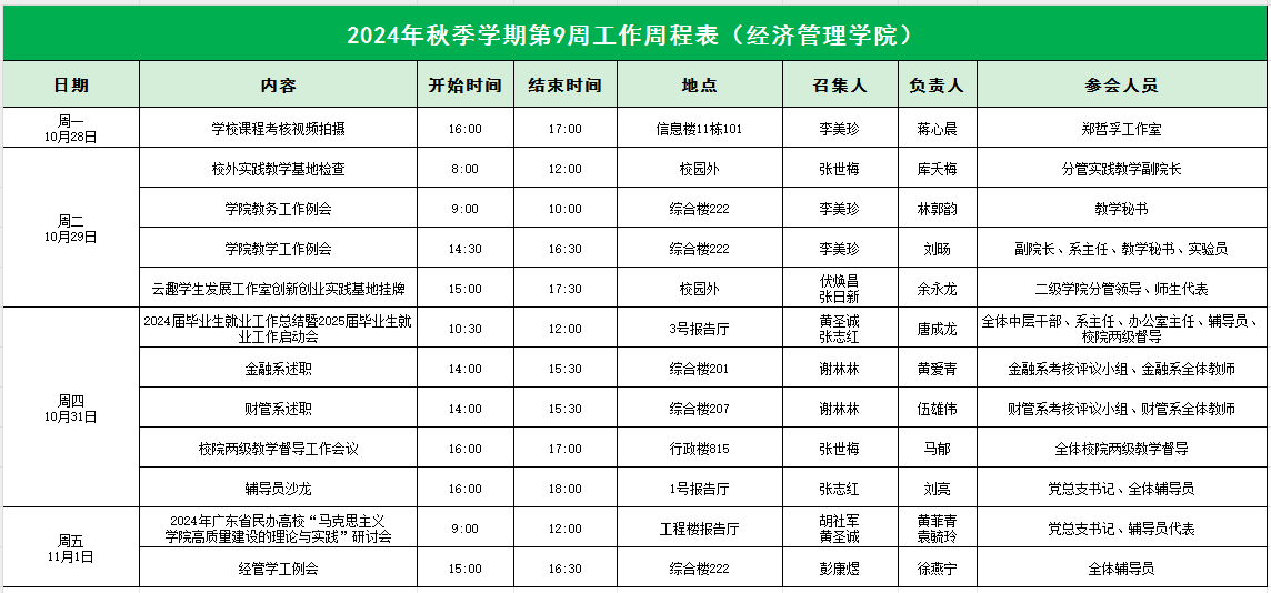 suncitygroup太阳集团2024年秋季学期第9周工作周程表
