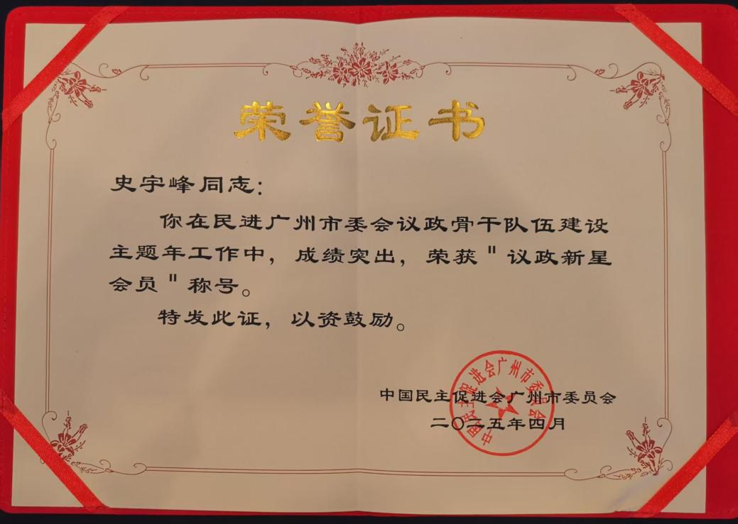 (通讯员:史宇峰)4月13日,民进广州市委员会召开“2025主题年”工作会议,会议表彰了议政先进集体和先进个人。我校suncitygroup太阳集团史宇峰博士被评为议政先进个人,获得“议政新星会员”称号。