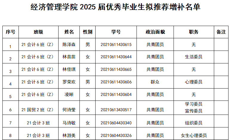 经符合申请条件的个人申请、班级公示、学院评审,现对我院2025届优秀毕业生拟推荐增补名单予以公示。公示时间为2025年4月16日至2025年4月18日。如对公示结果有异议,请于公示期间通过以下途径实名反馈,并提供真实、完整的佐证材料。逾期反馈,匿名反馈,未提供真实、完整佐证材料的不予受理。