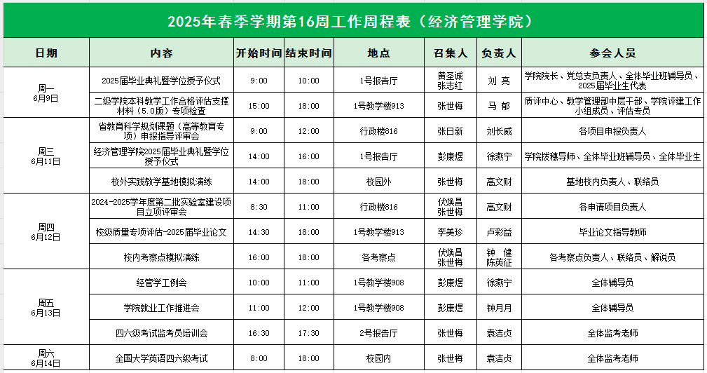 suncitygroup太阳集团2025年春季学期第16周工作周程表