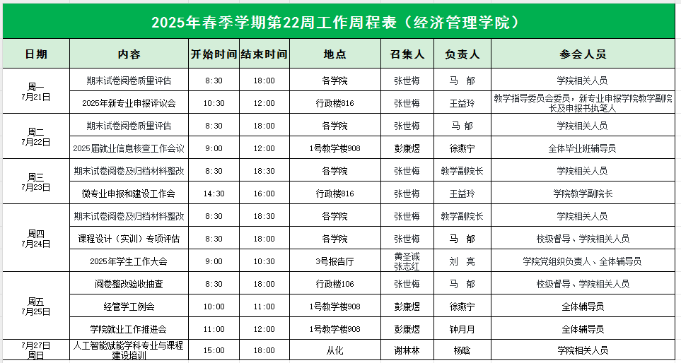suncitygroup太阳集团2025年春季学期第22周工作周程表