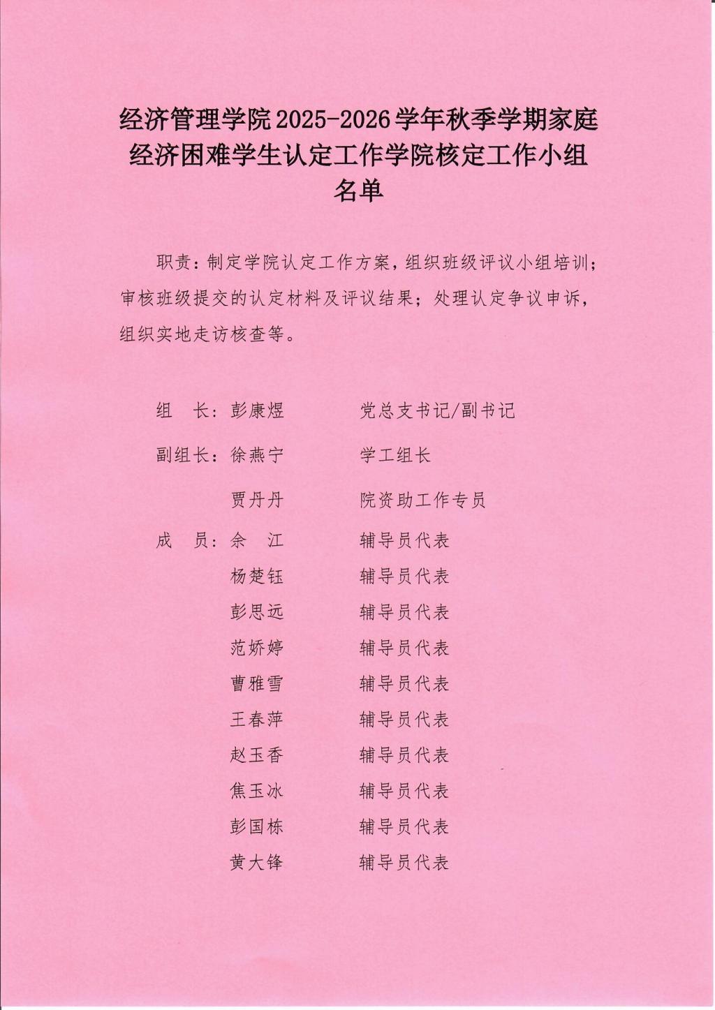 学院经济困难学生认定工作学院核定工作小组职责:制定学院认定工作方案,组织班级评议小组培训;审核班级提交的认定材料及评议结果;处理认定争议申诉,组织实地走访核查等。