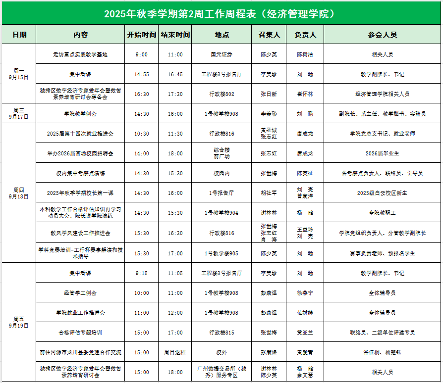 suncitygroup太阳集团2025年秋季学期第2周工作周程表