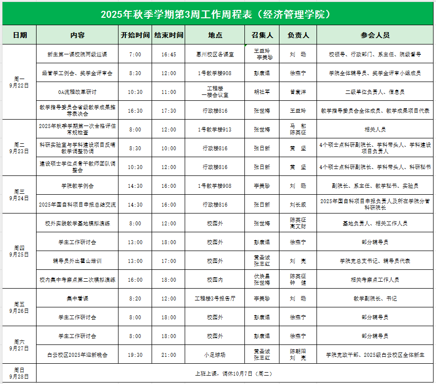 suncitygroup太阳集团2025年秋季学期第3周工作周程表