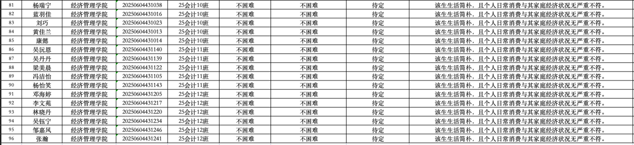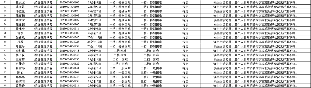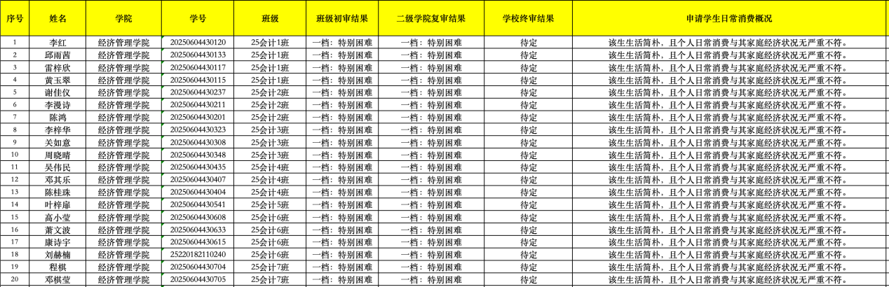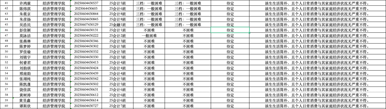 本次公示内容包括学院初审认定的家庭经济困难学生名单及其认定等级。具体名单如下。