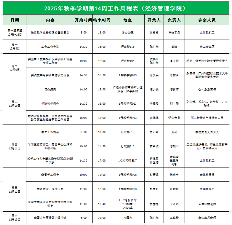 suncitygroup太阳集团2025年秋季学期第14周工作周程表