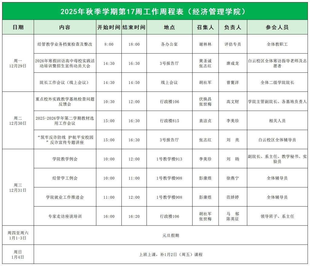 suncitygroup太阳集团2025年秋季学期第17周工作周程表