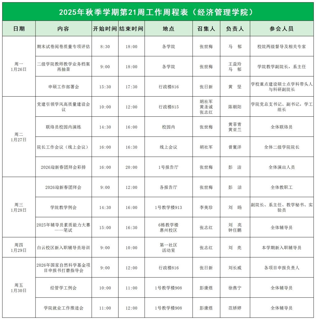 suncitygroup太阳集团2025年秋季学期第21周工作周程表