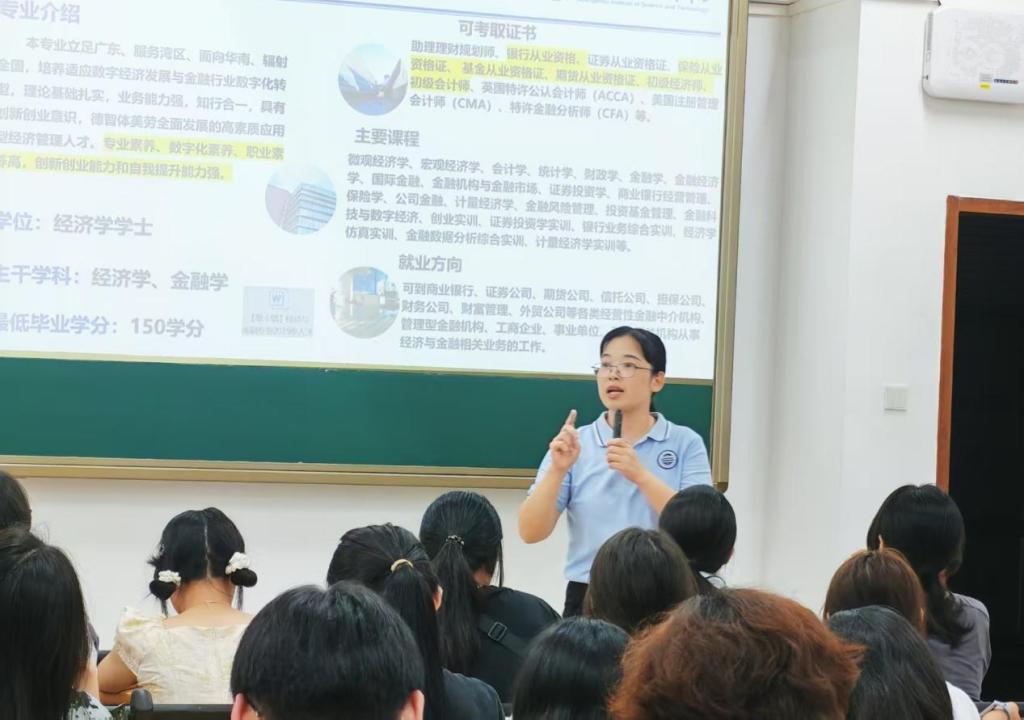 视频播放结束后,黄爱青主任围绕学院核心优势展开详细介绍。在专业布局上,学院开设会计学、财务管理、国际经济与贸易、大数据管理与应用、互联网金融、经济与金融6个本科专业,其中会计学为省级特色专业、校级一流专业,财务管理与国际经济与贸易为校级一流专业,应用经济学为院级重点学科,2022年更成功获批会计专业硕士点建设立项,学科体系持续完善;在师资力量上,学院专任教师中92.86%拥有博士或硕士学位,“双师双能型”教师占比超40%,金融系师资占全院28%,含3名教授、2名副教授及9名博士,另有南粤优秀教师、省民办高校优秀教师、帽峰学者等骨干力量,为教学质量提供坚实保障;在教学资源上,学院拥有省级经管实训中心、省级大学生实践基地、省级产教融合基地,校内建有金融实验室、证券投资模拟实训实验室等10间专业实验室(总面积1040平方米,设备总值560.02万元),目前正推进360余平方米的“数智化新商科实验教学中心”建设,涵盖金融科技、财务大数据、商业银行实训等多领域平台,课程方面现有3门省级一流课程及多门校级优质课程,全方位满足新生实践学习需求;在校企合作上,学院与广发证券、国元证券、价值在线等21家企业共建校外实习基地,还引进广鉴会计师事务所打造“真实场景、真实业务、真实操作”的校内实践基地,为新生打通“理论-实践-就业”衔接通道。
