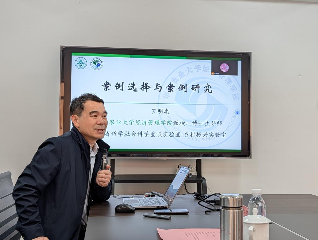 紧随其后,罗明忠院长带来题为“案例选择与案例研究”的精彩报告。罗明忠院长作为广东省知名农业经济专家,在案例研究与实证分析方面造诣深厚。他结合自身丰富的科研实践,系统阐述高质量案例的甄选标准、案例研究的规范流程、理论构建的方法以及如何通过生动的案例讲好中国管理故事,这对于我院教师提升研究的实践价值与应用穿透力具有极强的指导意义。
