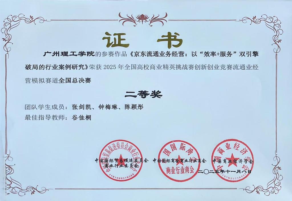 由张剑凯、钟梅琳、陈颖彤三位同学组成的团队,在谷佳桐老师的悉心指导下,凭借案例《京东流通业务经营:以“效率 + 服务” 双引擎破局的行业案例研究》,从全国众多参赛队伍中脱颖而出,成功摘得国家级二等奖!