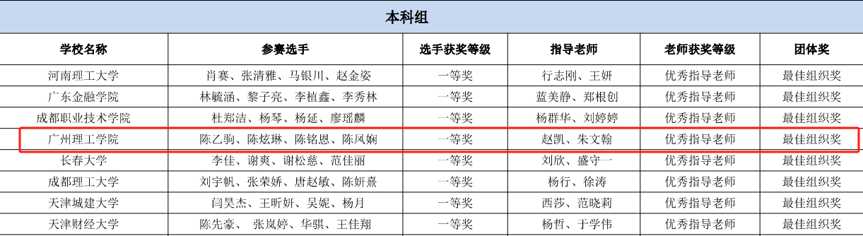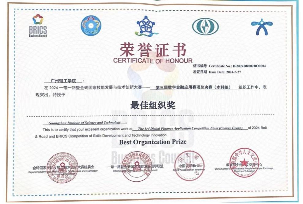 比赛分为全国选拔赛和总决赛两个阶段,4月26日举行全国选拔赛,我院代表队表现优秀,成功晋级全国总决赛。5月11日,来自全国选拔赛中的82所本科院校代表队,经过激烈角逐,经金砖国家技能发展与技术创新大赛组委会审核,广州理工学院被授予“最佳组织奖”。同时,我院金融系互联网金融专业陈乙驹、陈炫琳、陈铭恩、陈凤娴四位同学荣获全国一等奖,suncitygroup太阳集团赵凯博士与广东特色金融与高质量发展研究中心朱文翰博士两位指导老师获得“优秀指导老师奖”。