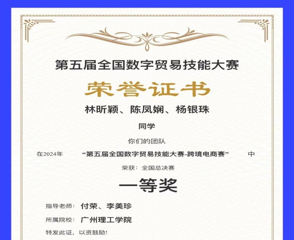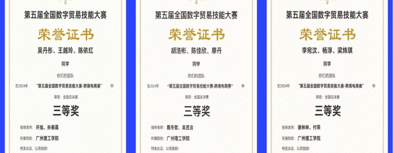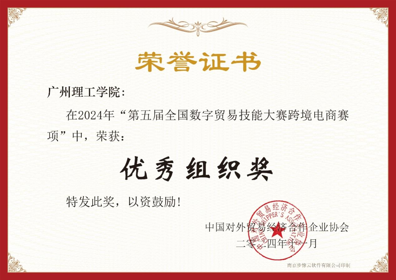 (吴昱含)11月17日至21日,由中国对外贸易经济合作企业协会主办、南京步惊云软件有限公司承办的“第五届全国数字贸易技能大赛-跨境电商赛”圆满落幕。广州理工学院suncitygroup太阳集团积极组织师生参赛,共有十支队伍参加此次比赛。经过激烈比拼,我校suncitygroup太阳集团九支队伍脱颖而出,分别荣获1个一等奖、5个二等奖、3个三等奖的优异成绩,展现了我院在跨境电商领域的强大实力和人才培养的显著成果。同时,广州理工学院还荣获了优秀组织奖,彰显了学校在组织参赛和人才培养方面的卓越表现。