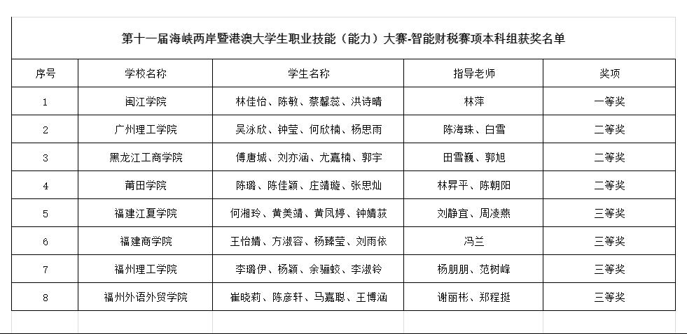 (通讯员:陈海珠)2024年10月27日,由福建省教育厅、福建省人力资源和社会保障厅、福建省互联网信息办公室和平潭综合实验区管委会主办福建商学院承、中联集团教育科技有限公司协办的“2024年第十一届海峡两岸暨港澳大学生职业技能(能力)大赛-智能财税赛项"的总决赛在云端成功举办。我院学子吴泳欣、钟莹、何欣楠、杨思雨组成的参赛团队,在陈海珠老师和白雪主任的指导下,荣获全国二等奖的优异成绩,展现了我校学子扎实的专业基础和实践能力。