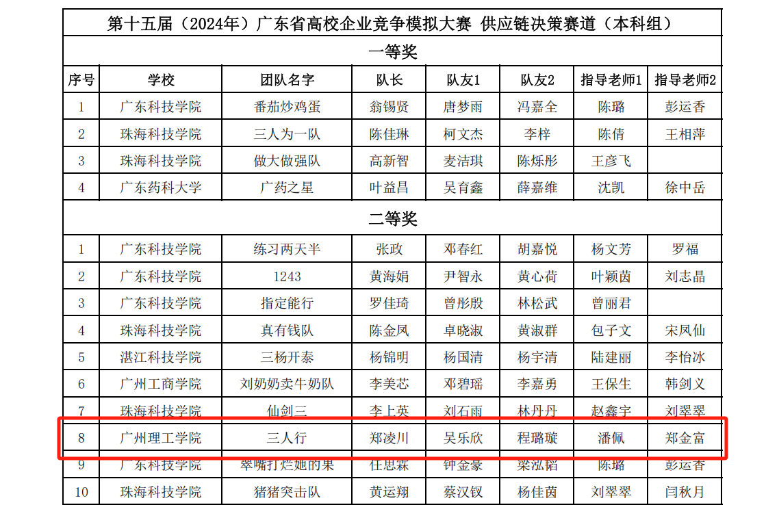 (通讯员:潘佩)2024年12月15日,第十五届广东省高校企业竞争模拟大赛在线上圆满落幕。此次大赛由中国管理现代化研究会决策模拟专业委员会主办,广东财经大学、深圳大学、深圳城市职业学院联合承办,吸引了来自全省32所高校的482支队伍积极参与。经过一整天的激烈角逐,我院学子郑凌川、吴乐欣、程璐璇组成的参赛团队,凭借出色的表现和卓越的专业素养,荣获了供应链决策赛道二等奖的佳绩。