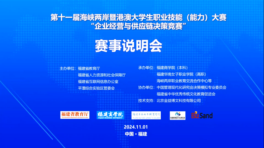 (通讯员:潘佩)11月2日,由福建省教育厅、福建省人力资源和社会保障厅、福建省互联网信息办公室以及平潭综合实验区管委会携手举办的“第十一届海峡两岸暨港澳大学生职业技能(能力)大赛——企业经营与供应链决策竞赛”在线上圆满落幕,此次大赛特别引入了全新的供应链赛道平台,标志着一个全新的竞技舞台正式开启。