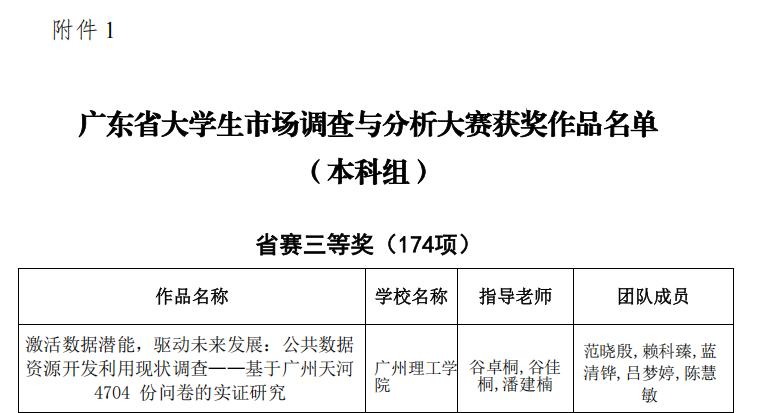 我校获奖作品《激活数据潜能,驱动未来发展:公共数据资源开发利用现状调查》的参赛学生团队历时5个月,走访了广州天河区的4704位群众,对来自广州市数据局、相关数据服务企业的18位专家进行了深度访谈,分析当前广州公共数据资源开发利用的现状和存在问题,为地方公共资源开发贡献智慧支持。