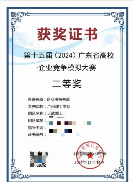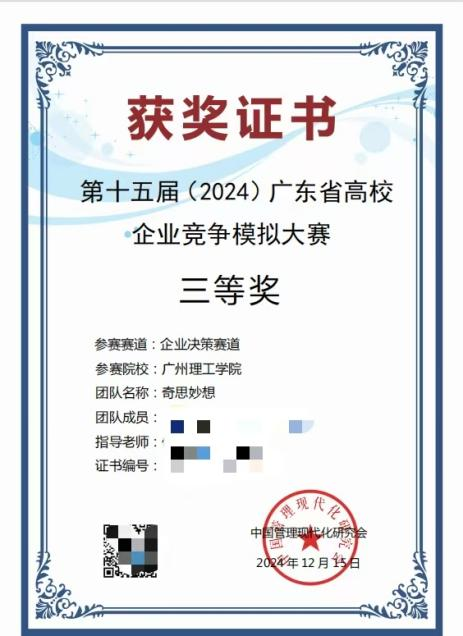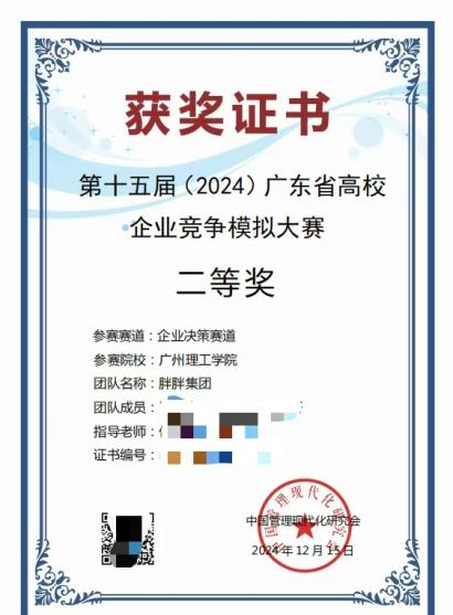 (通讯员:伍雄伟、荣红涛)2024年12月15日,第十五届广东省高校企业竞争模拟大赛在线上圆满落幕。此次大赛由中国管理现代化研究会决策模拟专业委员会主办,广东财经大学、深圳大学、深圳城市职业学院联合承办,吸引了来自全省32所高校的482支队伍积极参与。经过一整天的激烈角逐,我院代表队胖胖集团、天武军工、奇思妙想等队伍,凭借出色的表现和卓越的专业素养,荣获了企业决策赛道两个二等奖,一个三等奖的佳绩。