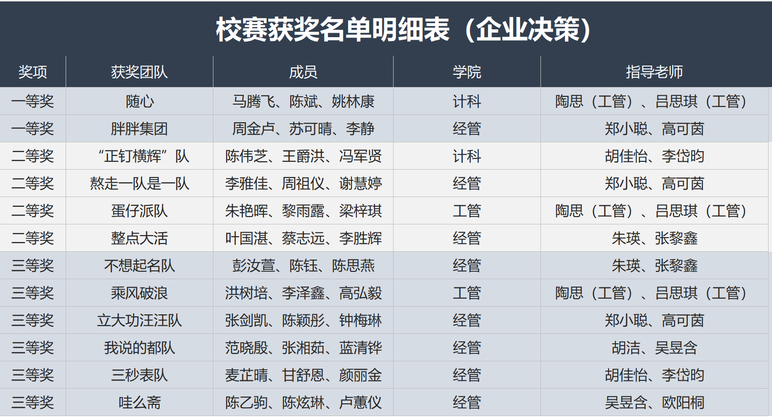 企业决策赛道校赛获奖名单