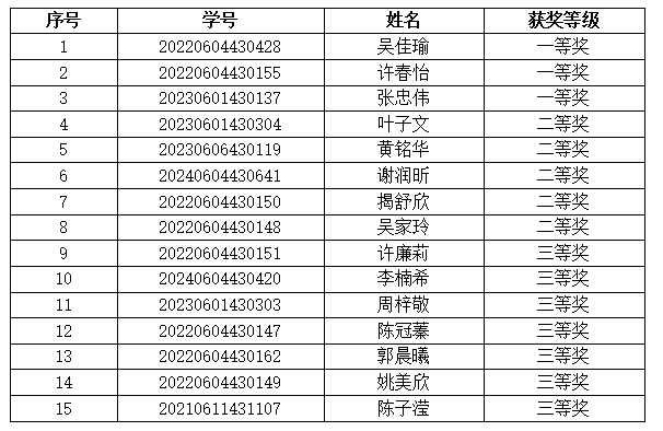 经过激烈角逐,最终15名选手脱颖而出,分别获一、二、三等奖。其中,吴佳瑜、许春怡、张忠伟荣获一等奖;叶子文、黄铭华等6人获二等奖;许廉莉、李楠希等7人获三等奖。我校将从获奖选手中选拔精英团队,代表学校征战下一阶段赛事。