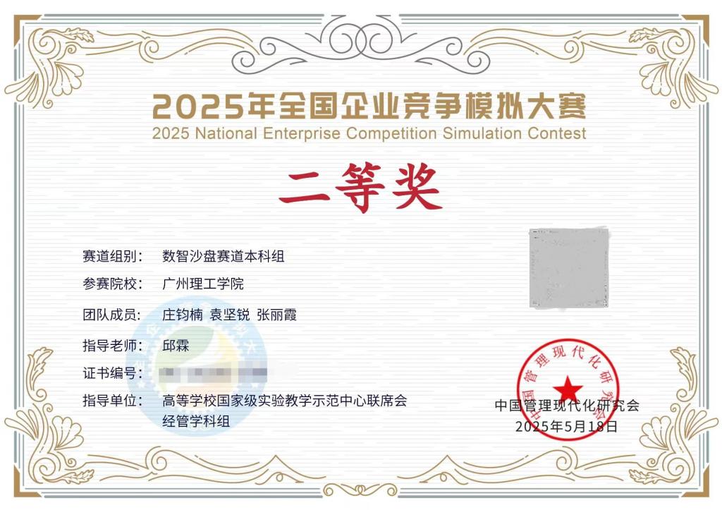 (通讯员:庄钧楠)由中国管理现代化研究会和高等学校国家级实验教学示范中心联席会经管学科组指导、中国管理现代化研究会决策模拟专业委员会主办的2025年全国企业竞争模拟大赛已圆满落幕。在我校邱霖老师的指导下,由22会计6班(z)庄钧楠担任队长,袁坚锐、张丽霞担任队员的团队在数智沙盘赛道(本科组)比赛中表现优异,最终荣获国家级二等奖。
