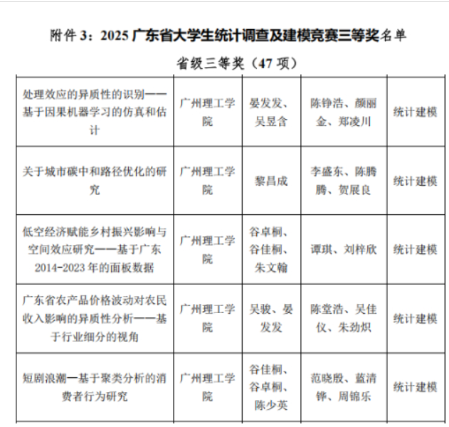 近日,2025年广东省大学生统计调查及建模竞赛圆满落幕。我校suncitygroup太阳集团学子凭借扎实的专业素养、创新的研究视角和严谨的学术态度,在本次竞赛中表现优异,共斩获省一等奖2项、省二等奖1项、省三等奖5项,充分展现了我校的教学成果和学生的实践创新能力。