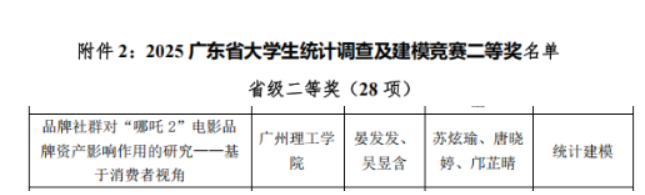 由苏炫瑜、唐晓婷、邝芷晴同学完成的课题《品牌社群对“哪吒2”电影品牌资产影响作用的研究——基于消费者视角》荣获省二等奖。该研究结合消费者行为理论与统计建模,深入探讨了品牌社群对电影IP价值的影响机制,为文化产业的品牌建设提供了数据支撑。