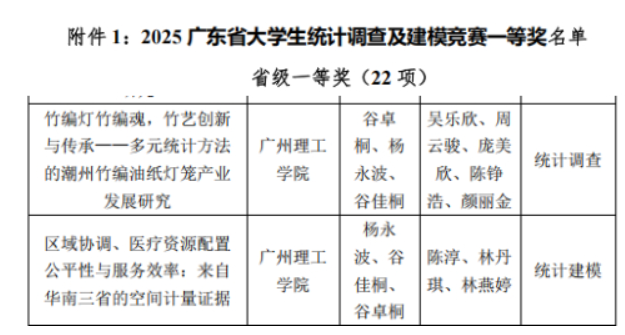 在本次竞赛中,由吴乐欣、周云骏、庞美欣、陈铮浩、颜丽金同学完成的课题《竹编灯竹编魂,竹艺创新与传承——多元统计方法的潮州竹编油纸灯笼产业发展研究》,以及陈淳、林丹琪、林燕婷同学完成的课题《区域协调、医疗资源配置公平性与服务效率:来自华南三省的空间计量证据》荣获省一等奖。两项研究分别聚焦传统文化产业的创新发展与区域医疗资源配置的公平性问题,运用多元统计方法与计量模型,提出了具有实践指导意义的结论,获得了评委的高度认可。