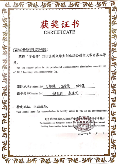 (通讯员 张建龙)9月14日,由高等学校国家级实验教学示范中心联席会经济与管理学科组主办的2017“学创杯”全国大学生创业综合模拟大赛网络选拔赛在当天下午举行。我校财经学院倪江崴、张建龙老师带队参赛,与10多所高校29支参赛队伍经过近5个小时的紧张比拼,两支参赛队伍荣获二等奖。