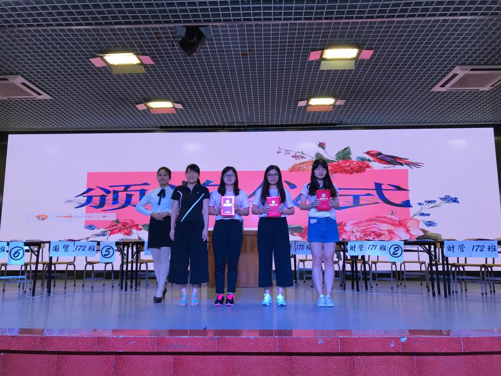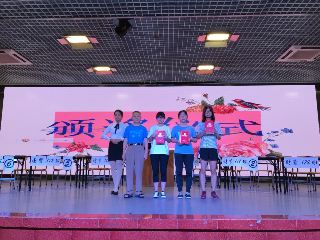 最后颁奖环节,17财管1班张文巧,邓伟娟,何志梅夺得冠军,杨润生教授为其颁发获奖证书。至此,我院第九届经济学原理知识竞赛圆满落幕。