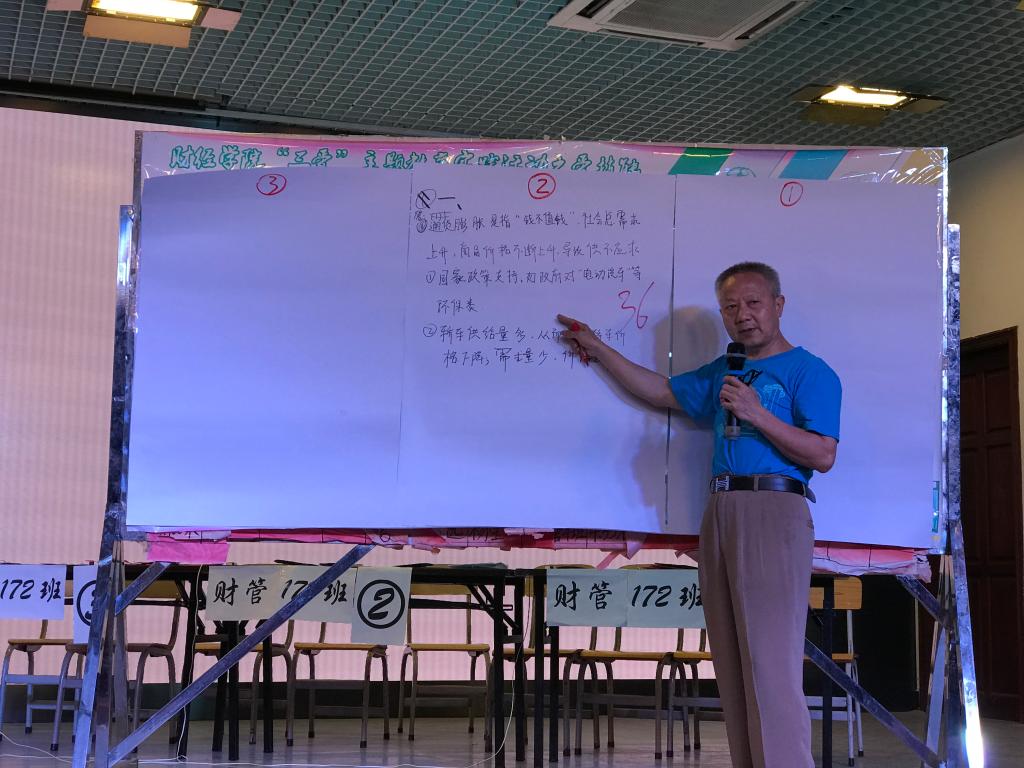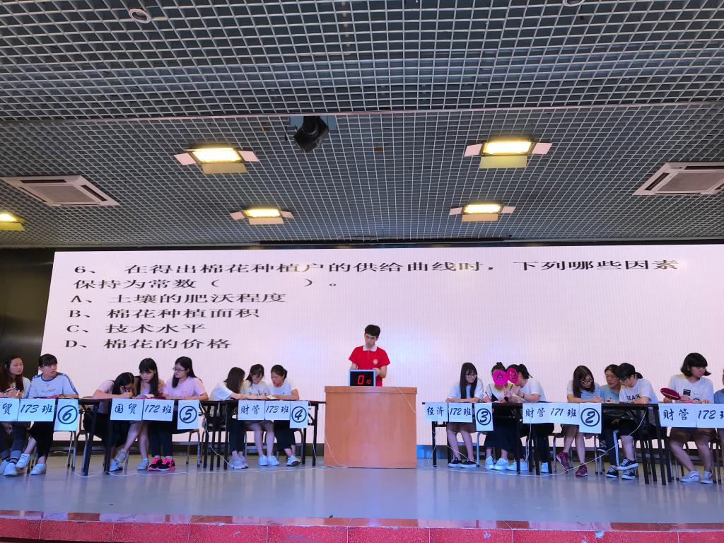 经过初赛激烈角逐,17经济2班、17财管1班、17财管2班、17财管3班、17国贸2班、17国贸3班共六支参赛队伍晋级决赛。本次决赛共分为必答环节、计算题环节、抢答环节和案例分析环节四个环节。决赛第一环节是必答环节,要求选手们在规定时间内迅速作答。紧接着便是计算环节与抢答环节,抢答环节紧张激烈的比拼将比赛推向了高潮。经过前三轮激烈角逐,17财管1班、17财管3班、17国贸2班、17国贸3班四支队伍脱颖而出,进入第四环节—案例分析题,选手们将答案写到答题板,并对解题思路进行现场讲述,再由评委老师进行点评给出成绩。现场,参赛同学精神饱满,默契配合,每支参赛队伍都尽情发挥,各施所长。竞赛过程中杨润生教授和许旭老师上台,对选手们的答题情况进行了精彩详细的分析和点评。互动环节听歌猜歌名倍受欢迎。比赛中还邀请了我院文艺队进行吉他弹唱表演,使竞赛过程更加丰富多彩。
