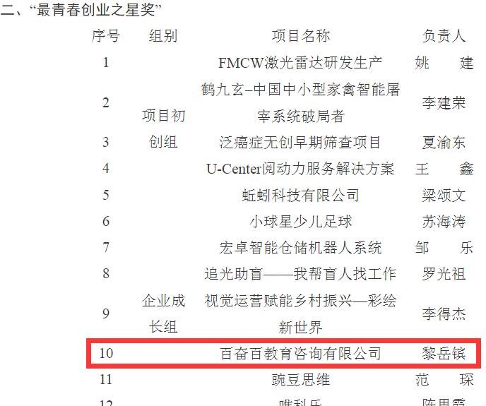 (通讯员 陈天勇)日前,通过专家评委打分、网络投票,“青创杯”第七届广州青年创新创业大赛获奖名单出炉啦!我校学生项目“百奋百教育咨询有限公司”荣获“最青春创业之星奖”。项目团队成员有:黎岳镔、黄慧瑛、谭斯琳、陈树洁、冯蔼琪、邹小莉、林小惠、程秀文。
