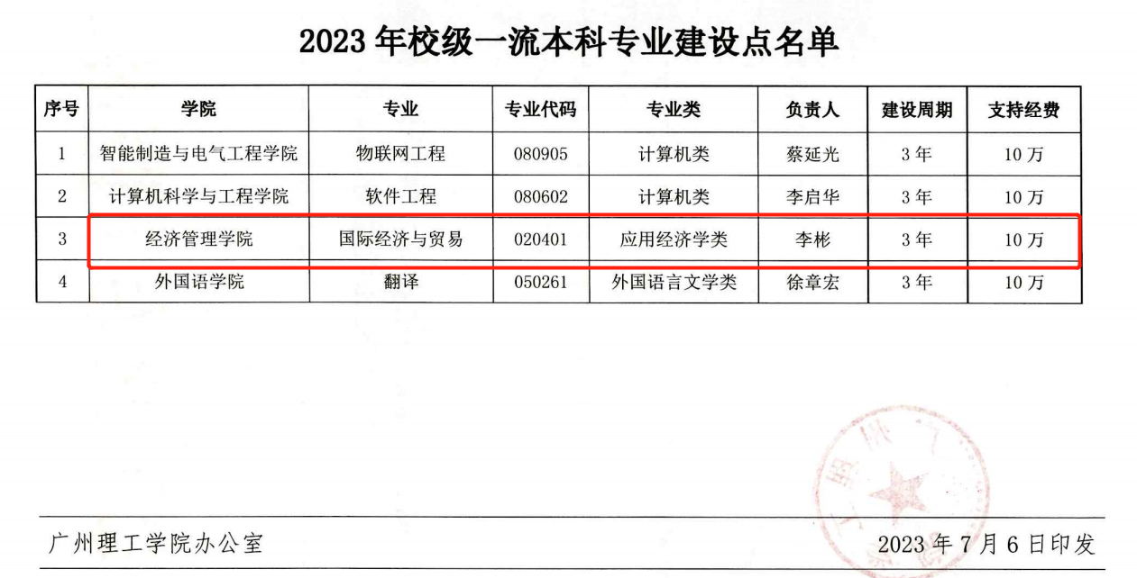 (通讯员:吴骏)近日,学校下发了《广州理工学院关于公布2023年校级一流本科专业建设点名单的通知》,公布了2023年度校级一流本科专业建设点名单,共有四个专业入选,我院国际经济与贸易专业也在名单之列。