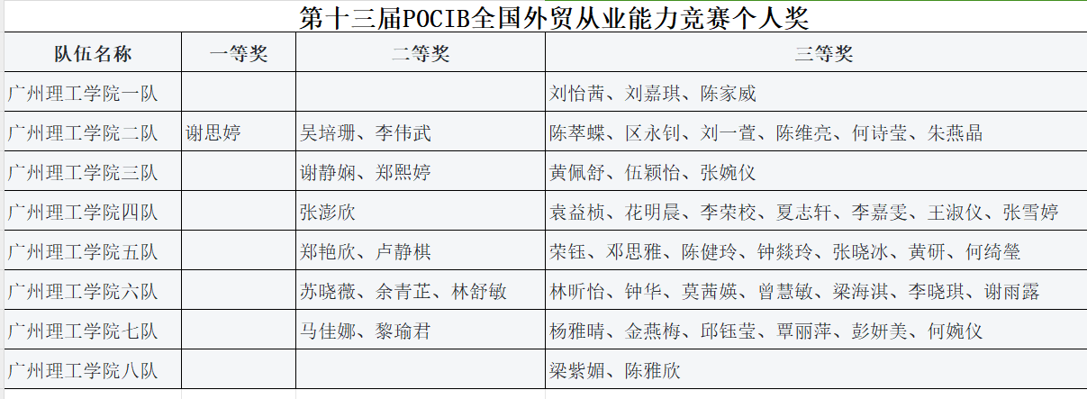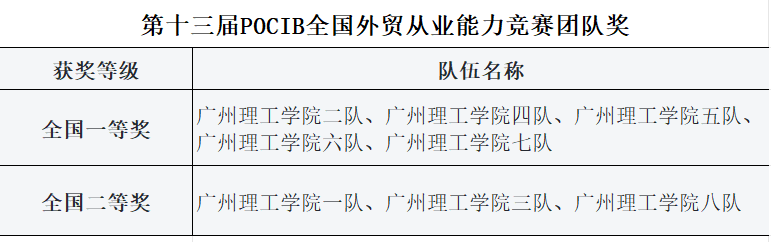 第十三届POCIB全国外贸从业能力大赛由中国国际贸易学会与全国外经贸职业教育教学指导委员会共同主办,包括POCIB国际贸易从业技能综合实训模块和数字贸易B2B模块两项内容。在本次比赛中,经济系副主任陈少英、倪江崴、李美珍、黄爱青、叶青、袁洁贞、陈树洁、朱文翰、谷佳桐等老师担任比赛的指导老师。在老师们的精心指导下,我院学子奋力拼搏,充分展现了团队合作精神和个人实力。他们获得了团队奖和个人奖的多项殊荣。其中,五支队伍获得了团体全国一等奖,三支队伍获得了团体全国二等奖。并有54位同学获得了个人的一等奖、二等奖和三等奖。