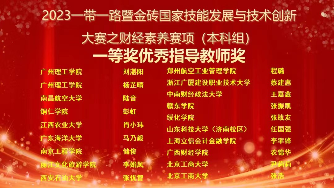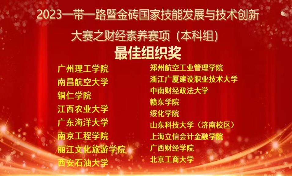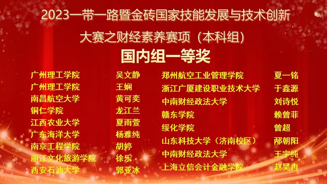 (通讯员:刘湛阳)11月26日,2023一带一路暨金砖国家技能发展与技术创新大赛之财经素养赛项(本科组)决赛在湖北武汉中南财经政法大学落下帷幕。财经素养赛项为大赛首届赛项,由金砖国家工商理事会中方理事会、一带一路暨金砖国家技能发展国际联盟、一带一路暨金砖国家技能发展与技术创新培训中心主办,中国发明协会、教育部中外人文交流中心联合主办。比赛包括财经素养专业知识和财经素养职业技能两项内容,要求选手独立完成财经素养专业知识考核、财经素养职业技能考核,展示院校财经素养教学与实践成果。