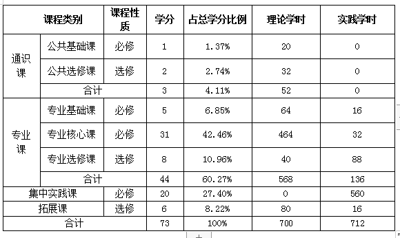 (一)课程体系结构及学时学分比例表