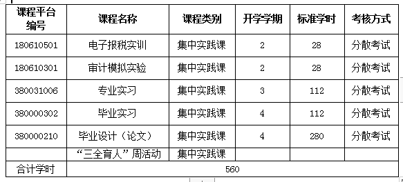 主要的专业实验/实训:会计模拟实验(综合)、电子报税实训、审计模拟实验、专业实习、毕业设计(论文)等集中实践课程