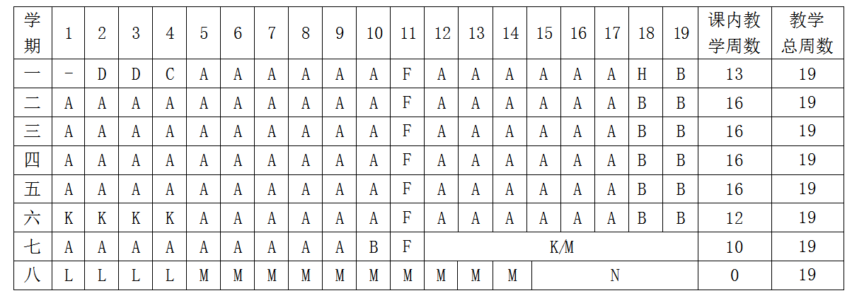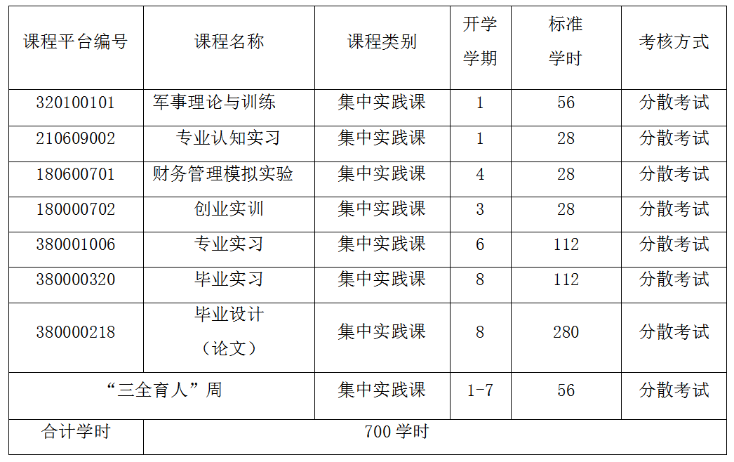 2.实践教学课:第七学期安排到企业实习;第七学期尽量只安排专业拓展课,第10周考试结束,第11周为“三全育人”周,第12周到19周,安排各类考证、考研、创业、实习、毕业论文(设计)等课程。