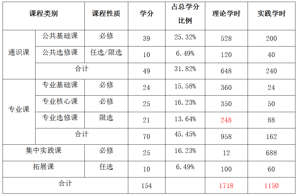 (一)课程体系结构及学时学分比例表