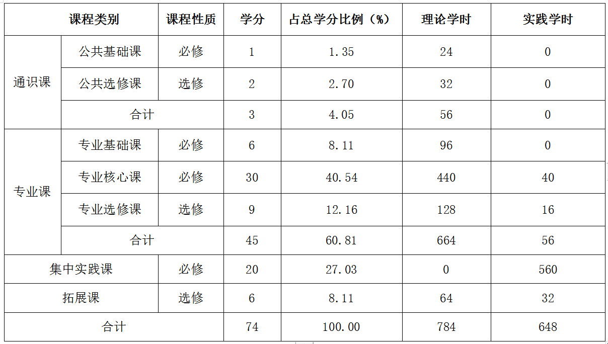 (一)课程体系结构及学时学分比例表