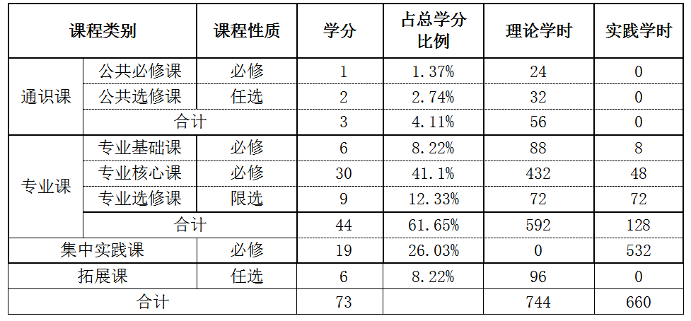 (一)课程体系结构及学时学分比例表