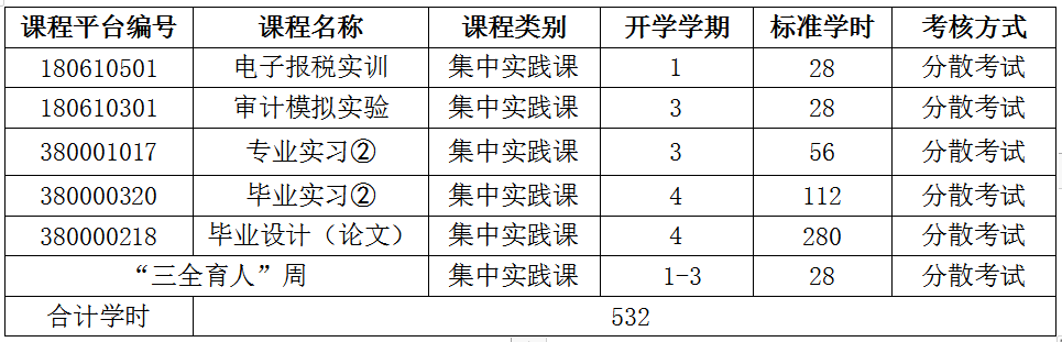主要的专业实验/实训:会计模拟实验(综合)、电子报税实训、审计模拟实验、专业实习、毕业实习、毕业设计(论文)等集中实践课程