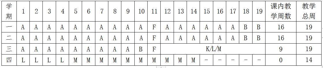 G课程设计 H认识实习 I金工实习 J电工实习 K专业实习 L毕业实习 M毕业设计(论文)N假期符号说明:A课堂教学 B考试 C入学教育 D军事训练 E社会调查与实践 F“三全育人”周