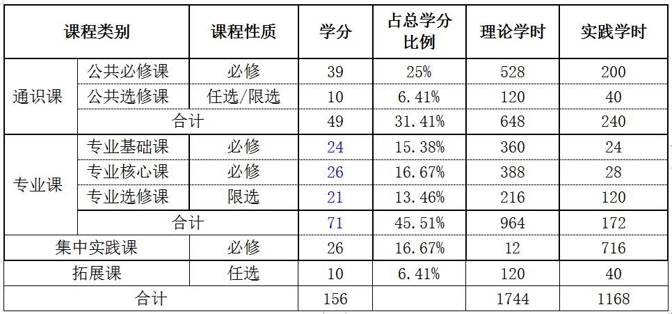 (二)毕业学分:本专业要求最低修满156学分。其中,必修课115学分、公共选修课(任选和限选)10学分、专业选修课最低21学分、拓展课至少选修10学分。学生完成人才培养方案规定课程,修满规定的学分,符合德、智、体、美、劳全面发展的基本要求,准予毕业。